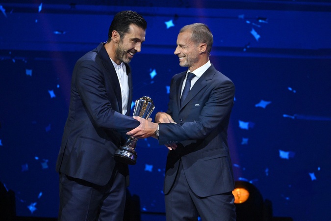 Gianluigi Buffon et Aleksander Ceferin, le président de l'UEFA, durant le tirage au sort des rencontres de la phase régulière de la Ligue des champions pour la saison 2024-2025 et remises du prix du meilleur buteur de tous les temps de l'UEFA Champions League à Cristiano Ronaldo et du Prix du président de l'UEFA 2024 à Gianluigi Buffon, au Grimaldi Forum à Monaco, le 29 août 2024. © Bruno Bebert / Bestimage C.Ronaldo receives the award for all-time top scorer at the UEFA draw for the 2024/2025 season at the Grimaldi Forum in Monaco on august 29th 2024