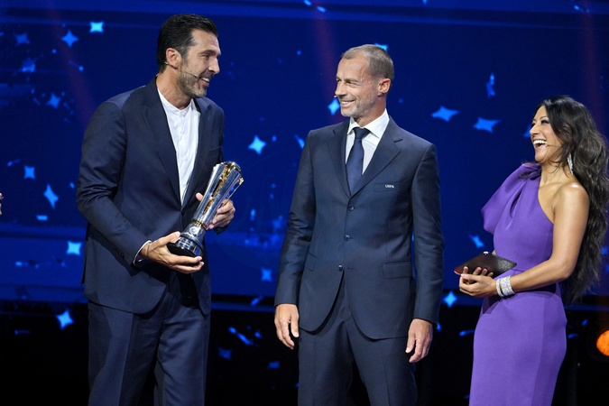 Gianluigi Buffon, Aleksander Ceferin, le président de l'UEFA et Reshmin Chowdhury durant le tirage au sort des rencontres de la phase régulière de la Ligue des champions pour la saison 2024-2025 et remises du prix du meilleur buteur de tous les temps de l'UEFA Champions League à Cristiano Ronaldo et du Prix du président de l'UEFA 2024 à Gianluigi Buffon, au Grimaldi Forum à Monaco, le 29 août 2024. © Bruno Bebert / Bestimage C.Ronaldo receives the award for all-time top scorer at the UEFA draw for the 2024/2025 season at the Grimaldi Forum in Monaco on august 29th 2024