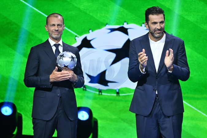 Aleksander Ceferin, le président de l'UEFA, et Gianluigi Buffon durant le tirage au sort des rencontres de la phase régulière de la Ligue des champions pour la saison 2024-2025 et remises du prix du meilleur buteur de tous les temps de l'UEFA Champions League à Cristiano Ronaldo et du Prix du président de l'UEFA 2024 à Gianluigi Buffon, au Grimaldi Forum à Monaco, le 29 août 2024. © Bruno Bebert / Bestimage C.Ronaldo receives the award for all-time top scorer at the UEFA draw for the 2024/2025 season at the Grimaldi Forum in Monaco on august 29th 2024