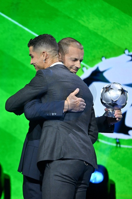 Aleksander Ceferin, le président de l'UEFA, et Cristiano Ronaldo durant le tirage au sort des rencontres de la phase régulière de la Ligue des champions pour la saison 2024-2025 et remises du prix du meilleur buteur de tous les temps de l'UEFA Champions League à Cristiano Ronaldo et du Prix du président de l'UEFA 2024 à Gianluigi Buffon, au Grimaldi Forum à Monaco, le 29 août 2024. © Bruno Bebert / Bestimage C.Ronaldo receives the award for all-time top scorer at the UEFA draw for the 2024/2025 season at the Grimaldi Forum in Monaco on august 29th 2024