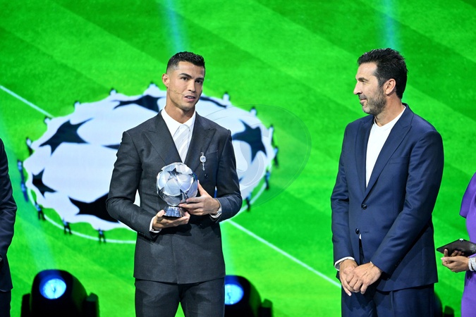 Cristiano Ronaldo reçoit le prix de meilleur buteur de tous les temps lors du tirage au sort UEFA pour la saison 2024/2025 au forum Grimaldi à Monaco