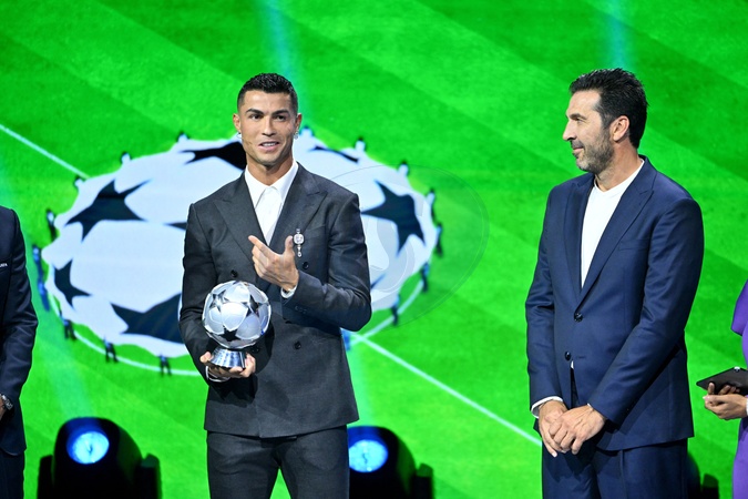 Cristiano Ronaldo reçoit le prix de meilleur buteur de tous les temps lors du tirage au sort UEFA pour la saison 2024/2025 au forum Grimaldi à Monaco