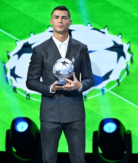 Cristiano Ronaldo reçoit le prix de meilleur buteur de tous les temps lors du tirage au sort UEFA pour la saison 2024/2025 au forum Grimaldi à Monaco