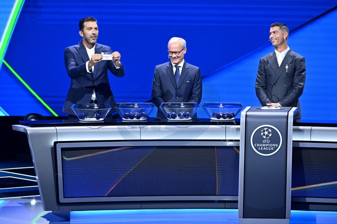 Gianluigi Buffon, Giorgio Marchetti, le vice secrétaire général de l'UEFA, et Cristiano Ronaldo durant le tirage au sort des rencontres de la phase régulière de la Ligue des champions pour la saison 2024-2025 et remises du prix du meilleur buteur de tous les temps de l'UEFA Champions League à Cristiano Ronaldo et du Prix du président de l'UEFA 2024 à Gianluigi Buffon, au Grimaldi Forum à Monaco, le 29 août 2024. © Bruno Bebert / Bestimage C.Ronaldo receives the award for all-time top scorer at the UEFA draw for the 2024/2025 season at the Grimaldi Forum in Monaco on august 29th 2024