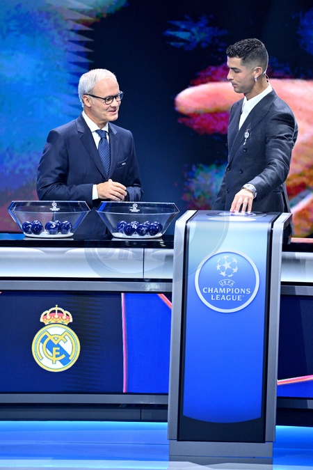 Giorgio Marchetti, le vice secrétaire général de l'UEFA, et Cristiano Ronaldo durant le tirage au sort des rencontres de la phase régulière de la Ligue des champions pour la saison 2024-2025 et remises du prix du meilleur buteur de tous les temps de l'UEFA Champions League à Cristiano Ronaldo et du Prix du président de l'UEFA 2024 à Gianluigi Buffon, au Grimaldi Forum à Monaco, le 29 août 2024. © Bruno Bebert / Bestimage C.Ronaldo receives the award for all-time top scorer at the UEFA draw for the 2024/2025 season at the Grimaldi Forum in Monaco on august 29th 2024