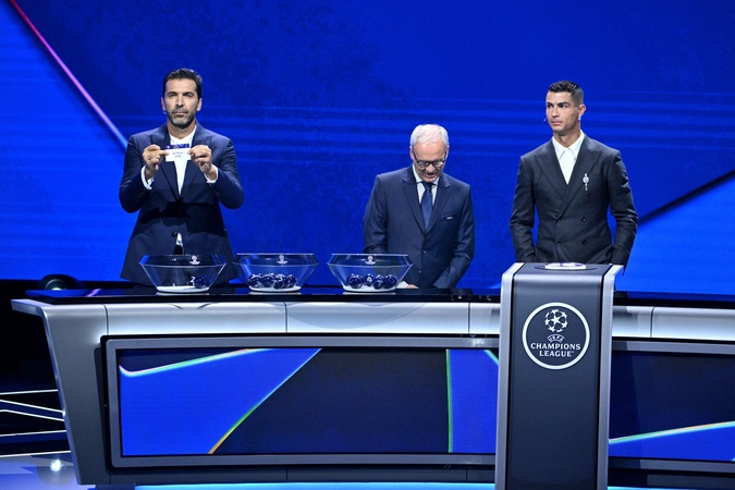 Gianluigi Buffon, Giorgio Marchetti, le vice secrétaire général de l'UEFA, et Cristiano Ronaldo durant le tirage au sort des rencontres de la phase régulière de la Ligue des champions pour la saison 2024-2025 et remises du prix du meilleur buteur de tous les temps de l'UEFA Champions League à Cristiano Ronaldo et du Prix du président de l'UEFA 2024 à Gianluigi Buffon, au Grimaldi Forum à Monaco, le 29 août 2024. © Bruno Bebert / Bestimage C.Ronaldo receives the award for all-time top scorer at the UEFA draw for the 2024/2025 season at the Grimaldi Forum in Monaco on august 29th 2024