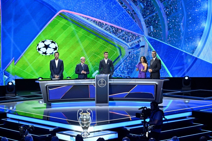 Gianluigi Buffon, Giorgio Marchetti, le vice secrétaire général de l'UEFA, Cristiano Ronaldo, Reshmin Chowdhury et Pedro Pinto, les présentateurs de la soirée, durant le tirage au sort des rencontres de la phase régulière de la Ligue des champions pour la saison 2024-2025 et remises du prix du meilleur buteur de tous les temps de l'UEFA Champions League à Cristiano Ronaldo et du Prix du président de l'UEFA 2024 à Gianluigi Buffon, au Grimaldi Forum à Monaco, le 29 août 2024. © Bruno Bebert / Bestimage C.Ronaldo receives the award for all-time top scorer at the UEFA draw for the 2024/2025 season at the Grimaldi Forum in Monaco on august 29th 2024