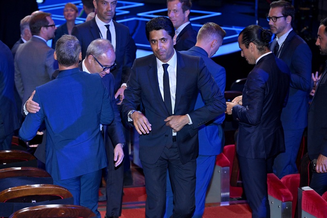 Nasser al-Khelaïfi, le président du PSG, durant le tirage au sort des rencontres de la phase régulière de la Ligue des champions pour la saison 2024-2025 et remises du prix du meilleur buteur de tous les temps de l'UEFA Champions League à Cristiano Ronaldo et du Prix du président de l'UEFA 2024 à Gianluigi Buffon, au Grimaldi Forum à Monaco, le 29 août 2024. © Bruno Bebert / Bestimage C.Ronaldo receives the award for all-time top scorer at the UEFA draw for the 2024/2025 season at the Grimaldi Forum in Monaco on august 29th 2024