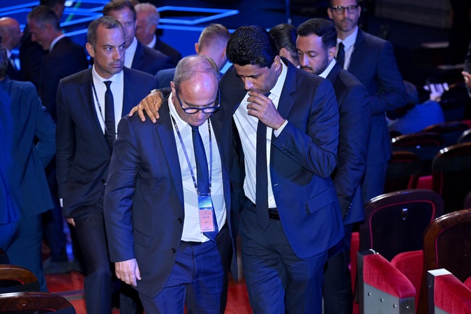 Nasser al-Khelaïfi, le président du PSG, durant le tirage au sort des rencontres de la phase régulière de la Ligue des champions pour la saison 2024-2025 et remises du prix du meilleur buteur de tous les temps de l'UEFA Champions League à Cristiano Ronaldo et du Prix du président de l'UEFA 2024 à Gianluigi Buffon, au Grimaldi Forum à Monaco, le 29 août 2024. © Bruno Bebert / Bestimage C.Ronaldo receives the award for all-time top scorer at the UEFA draw for the 2024/2025 season at the Grimaldi Forum in Monaco on august 29th 2024