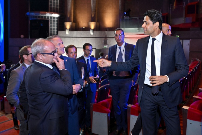 Nasser al-Khelaïfi, le président du PSG, durant le tirage au sort des rencontres de la phase régulière de la Ligue des champions pour la saison 2024-2025 et remises du prix du meilleur buteur de tous les temps de l'UEFA Champions League à Cristiano Ronaldo et du Prix du président de l'UEFA 2024 à Gianluigi Buffon, au Grimaldi Forum à Monaco, le 29 août 2024. © Bruno Bebert / Bestimage C.Ronaldo receives the award for all-time top scorer at the UEFA draw for the 2024/2025 season at the Grimaldi Forum in Monaco on august 29th 2024