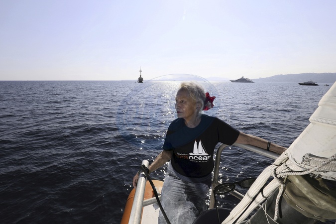 Agnès B. i jej załoga na pokładzie szkunera „Tara” w Antibes w ramach projektu prowadzonego przez Fundację Tara Océan