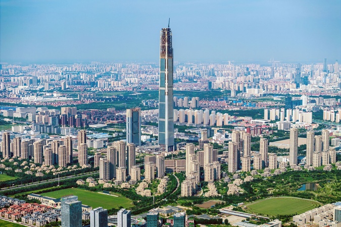 A view of the unfinished 597-meter-tall Goldin Finance 117 Tower in north China's Tianjin Municipality Wednesday, Aug. 28, 2024. The supertall made to the world's fifth place when it was topped out in 2015, but poor sales has failed its completion., Credit:FEATURECHINA / Avalon
