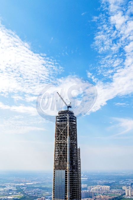A view of the unfinished 597-meter-tall Goldin Finance 117 Tower in north China's Tianjin Municipality Wednesday, Aug. 28, 2024. The supertall made to the world's fifth place when it was topped out in 2015, but poor sales has failed its completion., Credit:FEATURECHINA / Avalon