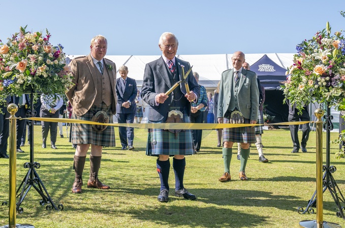 King Charles III uses a pair of gardening shears to officially open the Royal Horticultural Society of Aberdeen's 200th Flower Show at Duthie Park, Aberdeen. Picture date: Saturday August 31, 2024., Credit:Jane Barlow / Avalon