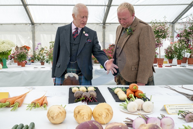 King Charles III with chairman Brian Grant views the vegetable competition at the Royal Horticultural Society of Aberdeen's 200th Flower Show at Duthie Park, Aberdeen. Picture date: Saturday August 31, 2024., Credit:Jane Barlow / Avalon