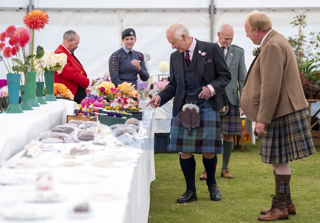 King Charles III with chairman Brian Grant during a visit to the Royal Horticultural Society of Aberdeen's 200th Flower Show at Duthie Park, Aberdeen. Picture date: Saturday August 31, 2024., Credit:Jane Barlow / Avalon