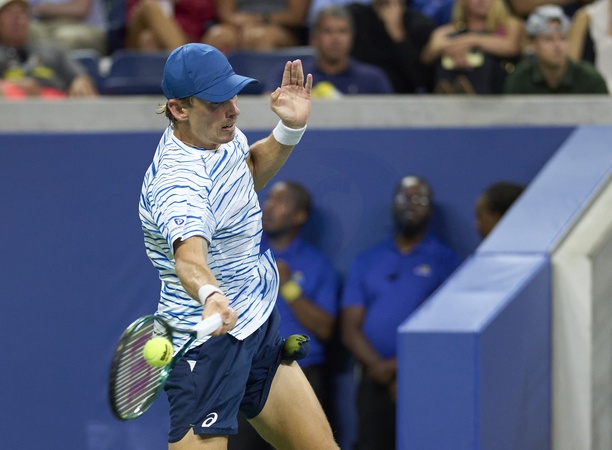 Alex De Minaur of Australia plays a forehand against Daniel Evans of Great Britain in their third round match on Armstrong Stadium at the 2024 US Open Tennis Championships at the National Tennis centre, New York, New York, 31 Aug 2024., Credit:Peter van den Berg / Avalon