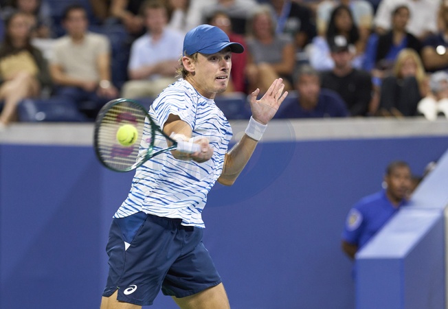 Alex De Minaur of Australia plays a forehand against Daniel Evans of Great Britain in their third round match on Armstrong Stadium at the 2024 US Open Tennis Championships at the National Tennis centre, New York, New York, 31 Aug 2024., Credit:Peter van den Berg / Avalon