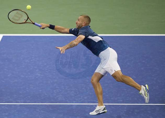 Daniel Evans of Great Britain plays a high ball behind him against Alex De Minaur of Australia in the third round on Armstrong Stadium at the 2024 US Open Tennis Championships at the National Tennis centre, New York, New York, 31 Aug 2024., Credit:Peter van den Berg / Avalon
