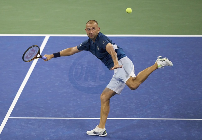Daniel Evans of Great Britain keeps his eye on the ball against Alex De Minaur of Australia in the third round on Armstrong Stadium at the 2024 US Open Tennis Championships at the National Tennis centre, New York, New York, 31 Aug 2024., Credit:Peter van den Berg / Avalon