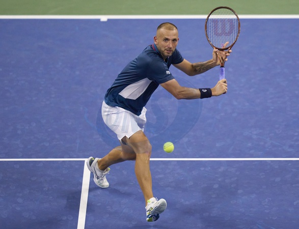 Daniel Evans of Great Britain volleys at the net against Alex De Minaur of Australia in the third round on Armstrong Stadium at the 2024 US Open Tennis Championships at the National Tennis centre, New York, New York, 31 Aug 2024., Credit:Peter van den Berg / Avalon