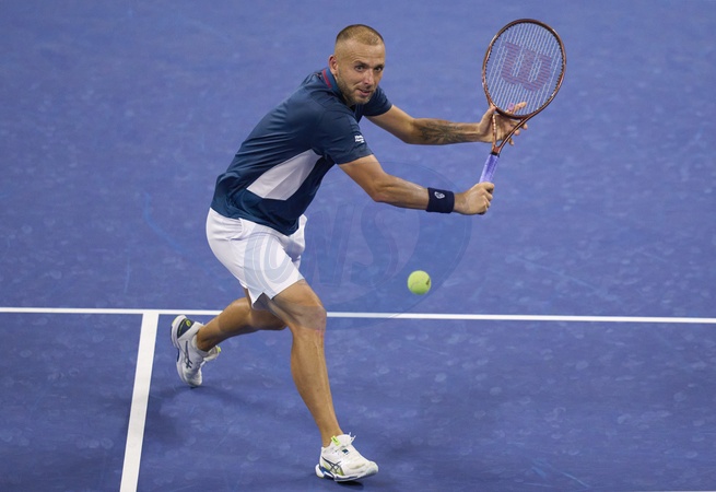 Daniel Evans of Great Britain volleys at the net against Alex De Minaur of Australia in the third round on Armstrong Stadium at the 2024 US Open Tennis Championships at the National Tennis centre, New York, New York, 31 Aug 2024., Credit:Peter van den Berg / Avalon