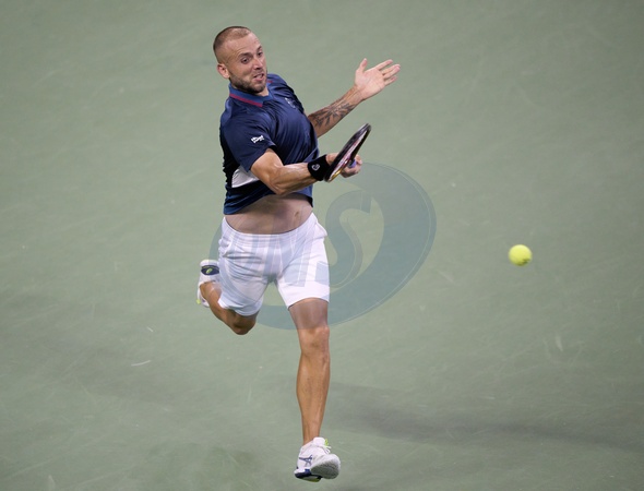 Daniel Evans of Great Britain plays a forehand against Alex De Minaur of Australia in the third round on Armstrong Stadium at the 2024 US Open Tennis Championships at the National Tennis centre, New York, New York, 31 Aug 2024., Credit:Peter van den Berg / Avalon