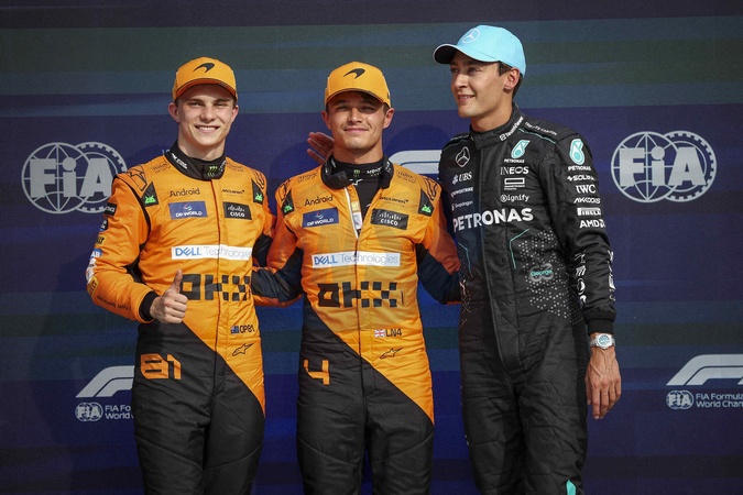 NORRIS Lando (gbr), McLaren F1 Team MCL38, PIASTRI Oscar (aus), McLaren F1 Team MCL38, RUSSELL George (gbr), Mercedes AMG F1 Team W15, portrait during the Formula 1 Pirelli Gran Premio d'Italia 2024, Italian Grand Prix 2024, 16th round of the 2024 Formula One World Championship from August 30 to September 1, 2024 on the Autodromo Nazionale Monza, in Monza, Italy - © dpi / Panoramic / Bestimage