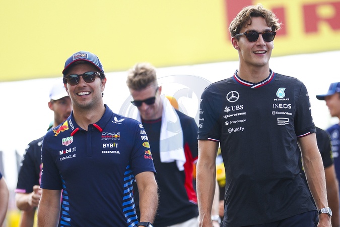 PEREZ Sergio (mex), Red Bull Racing RB20, portrait and RUSSELL George (gbr), Mercedes AMG F1 Team W15, portrait during the Formula 1 Pirelli Gran Premio d'Italia 2024, Italian Grand Prix 2024, 16th round of the 2024 Formula One World Championship from August 30 to September 1, 2024 on the Autodromo Nazionale Monza, in Monza, Italy - © Dppi / Panoramic / Bestimage