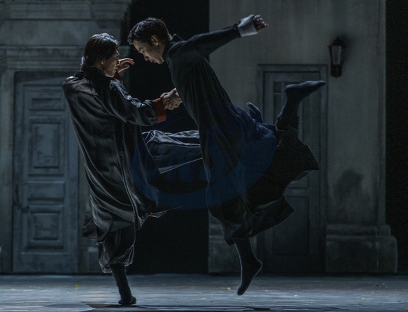 Sadlers Wells, London, UK. 29th August, 2024. Wing Chun - A fusion of contemporary dance, drama and martial arts tells the true story of Grandmaster Yip Man, trainer of Bruce Lee, choreographed by Han Zhen and Zhou Liya & written by Feng Shuangbai. Running from 30 Aug-7 Sept the spectacle tells the story of the 300-year-old martial art Wing Chun and the man who is credited with bringing it to the world, Grandmaster Yip Man, the man who trained Bruce Lee and founded The Ving Tsun Athletic Association. Image: Fight scene, Praying Mantis Master - He Junbo, Tai Chi Master - Zhang Zhenguo, Credit:MALCOLM PARK / Avalon