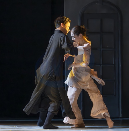 Sadlers Wells, London, UK. 29th August, 2024. Wing Chun - A fusion of contemporary dance, drama and martial arts tells the true story of Grandmaster Yip Man, trainer of Bruce Lee, choreographed by Han Zhen and Zhou Liya & written by Feng Shuangbai. Running from 30 Aug-7 Sept the spectacle tells the story of the 300-year-old martial art Wing Chun and the man who is credited with bringing it to the world, Grandmaster Yip Man, the man who trained Bruce Lee and founded The Ving Tsun Athletic Association. Image: Main character and his wife: Yip Man played by Chang Hongji, Yongcheng played by Xu Tianhui., Credit:MALCOLM PARK / Avalon