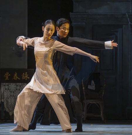 Sadlers Wells, London, UK. 29th August, 2024. Wing Chun - A fusion of contemporary dance, drama and martial arts tells the true story of Grandmaster Yip Man, trainer of Bruce Lee, choreographed by Han Zhen and Zhou Liya & written by Feng Shuangbai. Running from 30 Aug-7 Sept the spectacle tells the story of the 300-year-old martial art Wing Chun and the man who is credited with bringing it to the world, Grandmaster Yip Man, the man who trained Bruce Lee and founded The Ving Tsun Athletic Association. Image: Main character and his wife: Yip Man played by Chang Hongji, Yongcheng played by Xu Tianhui., Credit:MALCOLM PARK / Avalon