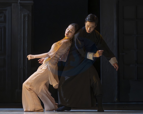 Sadlers Wells, London, UK. 29th August, 2024. Wing Chun - A fusion of contemporary dance, drama and martial arts tells the true story of Grandmaster Yip Man, trainer of Bruce Lee, choreographed by Han Zhen and Zhou Liya & written by Feng Shuangbai. Running from 30 Aug-7 Sept the spectacle tells the story of the 300-year-old martial art Wing Chun and the man who is credited with bringing it to the world, Grandmaster Yip Man, the man who trained Bruce Lee and founded The Ving Tsun Athletic Association. Image: Main character and his wife: Yip Man played by Chang Hongji, Yongcheng played by Xu Tianhui., Credit:MALCOLM PARK / Avalon