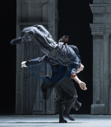 Sadlers Wells, London, UK. 29th August, 2024. Wing Chun - A fusion of contemporary dance, drama and martial arts tells the true story of Grandmaster Yip Man, trainer of Bruce Lee, choreographed by Han Zhen and Zhou Liya & written by Feng Shuangbai. Running from 30 Aug-7 Sept the spectacle tells the story of the 300-year-old martial art Wing Chun and the man who is credited with bringing it to the world, Grandmaster Yip Man, the man who trained Bruce Lee and founded The Ving Tsun Athletic Association. Image: Fight scene, Praying Mantis Master - He Junbo, Tai Chi Master - Zhang Zhenguo, Credit:MALCOLM PARK / Avalon
