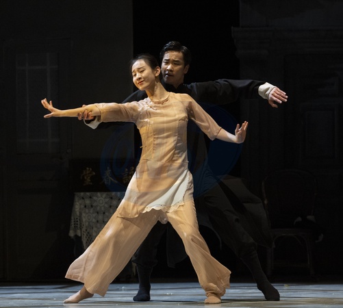 Sadlers Wells, London, UK. 29th August, 2024. Wing Chun - A fusion of contemporary dance, drama and martial arts tells the true story of Grandmaster Yip Man, trainer of Bruce Lee, choreographed by Han Zhen and Zhou Liya & written by Feng Shuangbai. Running from 30 Aug-7 Sept the spectacle tells the story of the 300-year-old martial art Wing Chun and the man who is credited with bringing it to the world, Grandmaster Yip Man, the man who trained Bruce Lee and founded The Ving Tsun Athletic Association. Image: Main character and his wife: Yip Man played by Chang Hongji, Yongcheng played by Xu Tianhui., Credit:MALCOLM PARK / Avalon