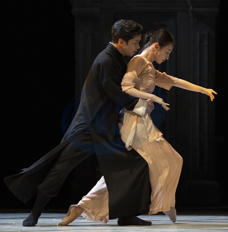 Sadlers Wells, London, UK. 29th August, 2024. Wing Chun - A fusion of contemporary dance, drama and martial arts tells the true story of Grandmaster Yip Man, trainer of Bruce Lee, choreographed by Han Zhen and Zhou Liya & written by Feng Shuangbai. Running from 30 Aug-7 Sept the spectacle tells the story of the 300-year-old martial art Wing Chun and the man who is credited with bringing it to the world, Grandmaster Yip Man, the man who trained Bruce Lee and founded The Ving Tsun Athletic Association. Image: Main character and his wife: Yip Man played by Chang Hongji, Yongcheng played by Xu Tianhui., Credit:MALCOLM PARK / Avalon