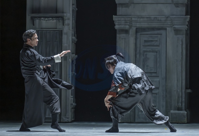 Sadlers Wells, London, UK. 29th August, 2024. Wing Chun - A fusion of contemporary dance, drama and martial arts tells the true story of Grandmaster Yip Man, trainer of Bruce Lee, choreographed by Han Zhen and Zhou Liya & written by Feng Shuangbai. Running from 30 Aug-7 Sept the spectacle tells the story of the 300-year-old martial art Wing Chun and the man who is credited with bringing it to the world, Grandmaster Yip Man, the man who trained Bruce Lee and founded The Ving Tsun Athletic Association. Image: Fight scene, Praying Mantis Master - He Junbo, Tai Chi Master - Zhang Zhenguo, Credit:MALCOLM PARK / Avalon