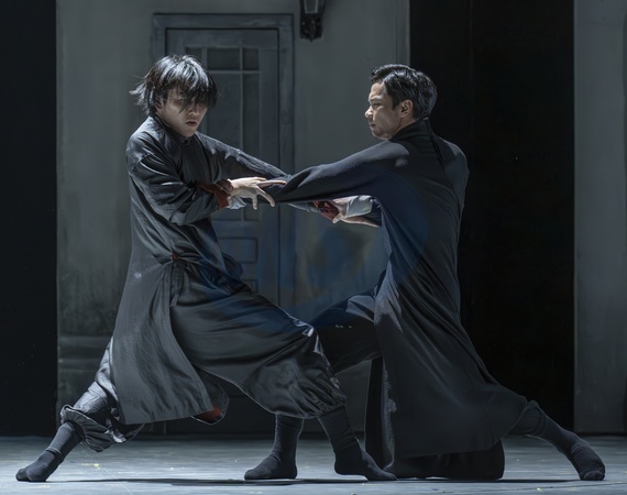 Sadlers Wells, London, UK. 29th August, 2024. Wing Chun - A fusion of contemporary dance, drama and martial arts tells the true story of Grandmaster Yip Man, trainer of Bruce Lee, choreographed by Han Zhen and Zhou Liya & written by Feng Shuangbai. Running from 30 Aug-7 Sept the spectacle tells the story of the 300-year-old martial art Wing Chun and the man who is credited with bringing it to the world, Grandmaster Yip Man, the man who trained Bruce Lee and founded The Ving Tsun Athletic Association. Image: Fight scene, Praying Mantis Master - He Junbo, Tai Chi Master - Zhang Zhenguo, Credit:MALCOLM PARK / Avalon