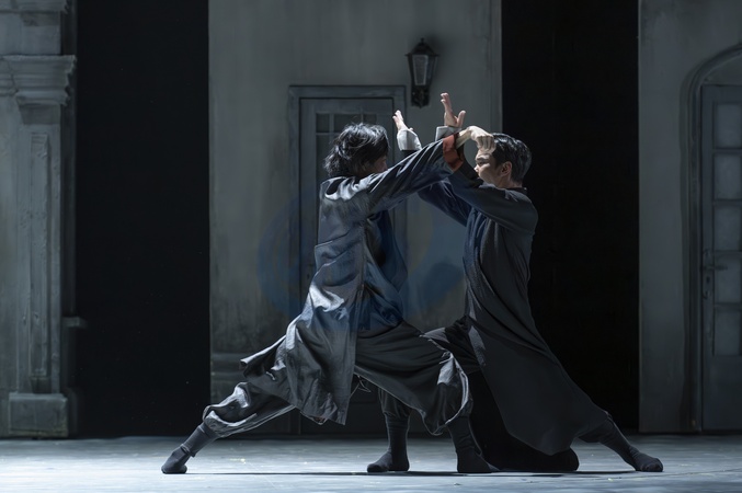 Sadlers Wells, London, UK. 29th August, 2024. Wing Chun - A fusion of contemporary dance, drama and martial arts tells the true story of Grandmaster Yip Man, trainer of Bruce Lee, choreographed by Han Zhen and Zhou Liya & written by Feng Shuangbai. Running from 30 Aug-7 Sept the spectacle tells the story of the 300-year-old martial art Wing Chun and the man who is credited with bringing it to the world, Grandmaster Yip Man, the man who trained Bruce Lee and founded The Ving Tsun Athletic Association. Image: Fight scene, Praying Mantis Master - He Junbo, Tai Chi Master - Zhang Zhenguo, Credit:MALCOLM PARK / Avalon