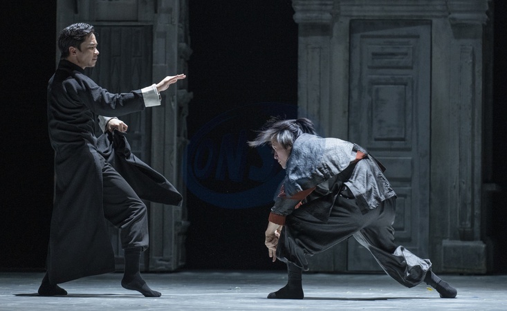 Sadlers Wells, London, UK. 29th August, 2024. Wing Chun - A fusion of contemporary dance, drama and martial arts tells the true story of Grandmaster Yip Man, trainer of Bruce Lee, choreographed by Han Zhen and Zhou Liya & written by Feng Shuangbai. Running from 30 Aug-7 Sept the spectacle tells the story of the 300-year-old martial art Wing Chun and the man who is credited with bringing it to the world, Grandmaster Yip Man, the man who trained Bruce Lee and founded The Ving Tsun Athletic Association. Image: Fight scene, Praying Mantis Master - He Junbo, Tai Chi Master - Zhang Zhenguo, Credit:MALCOLM PARK / Avalon