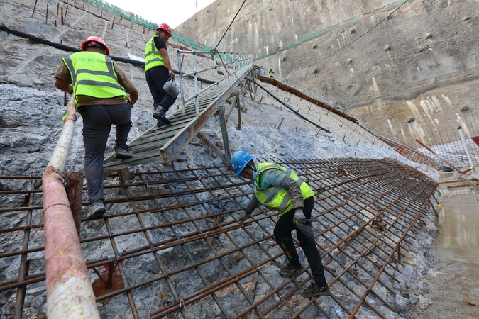 Workers labor at the construction site of Dongzhuang Water Conservancy Hub Project in Liquan county in northwest China's Shaanxi province Friday, Aug. 30, 2024. The multi-billion dollar project, featuring a 230-meter-high dam in the Jinghe Grand Canyon, aims to reduce sediment entering the Weihe River, the major tributary to the Yellow River, by 3.05 billion tons within 50 years., Credit:ROY STONE / Avalon