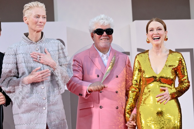 02/09/2024 Biennale di Venezia, 81 Mostra Internazionale d' Arte Cinematografica, red carpet del film The Room next door. Nella foto Tilda Swinton, Pedro Almodovar, Julianne Moore, Credit:Maria Laura Antonelli / Avalon