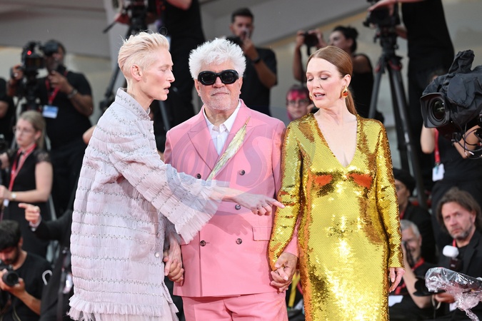 02/09/2024 Biennale di Venezia, 81 Mostra Internazionale d' Arte Cinematografica, red carpet del film The Room next door. Nella foto Tilda Swinton, Pedro Almodovar, Julianne Moore, Credit:Maria Laura Antonelli / Avalon