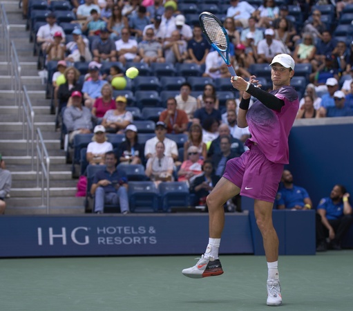 Jack Draper of Great Britain plays a forehand against Tomas Machac of the Czech Republic during round four on Armstrong Stadium at the 2024 US Open Tennis Championships at the National Tennis centre, New York, New York, 2 September 2024., Credit:Peter van den Berg / Avalon