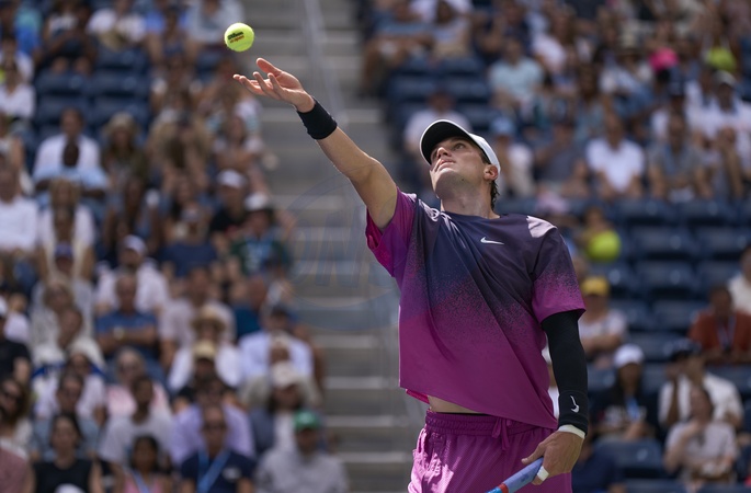 Jack Draper of Great Britain serves the ball against Tomas Machac of the Czech Republic during round four on Armstrong Stadium at the 2024 US Open Tennis Championships at the National Tennis centre, New York, New York, 2 September 2024., Credit:Peter van den Berg / Avalon