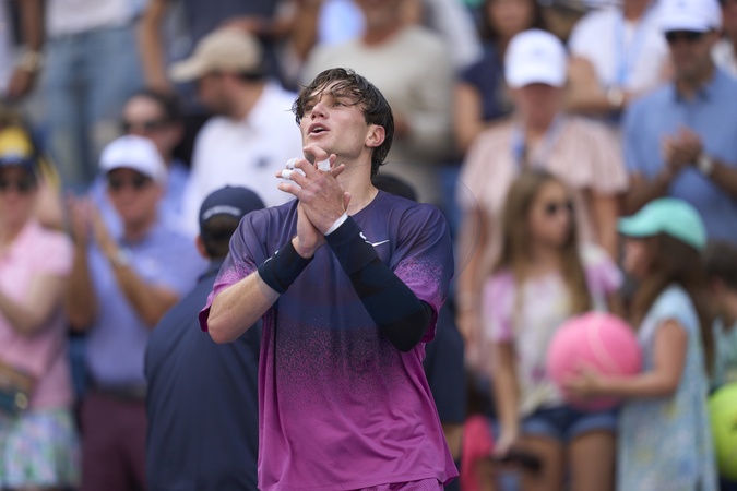 Jack Draper of Great Britain applauds the crowd after beating Tomas Machac of the Czech Republic in round four on Armstrong Stadium at the 2024 US Open Tennis Championships at the National Tennis centre, New York, New York, 2 September 2024., Credit:Peter van den Berg / Avalon