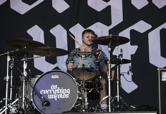 As Everything Unfolds performing live at Slam Dunk South Festival, Hatfield Park on 25 May 2024Jamie Gowers ,drummerAs Everything Unfolds is a British rock band that formed in ‘13They have released one album "Within Each Lies The Other” in ‘21The group's sound incorporates elements of alternative rock, post-punk, and progressive metal., Credit:Dafydd Owen / Avalon