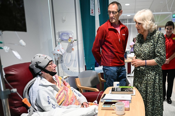 Britain's Queen Camilla (R) speaks with cancer patient Sandra Tyler (L) undergoing a chemotherapy session, as she visits the Dyson Cancer Centre, at the Royal United Hospitals Bath NHS Foundation Trust, in Bath, western England, on September 3, 2024. The new Dyson Cancer Centre brings together the majority of the Royal United Hospital's cancer services, including a research hub, chemotherapy and radiotherapy services, a 22-bed in-patient ward, a dedicated pharmacy and nuclear medicine and physics teams., Credit:JUSTIN TALLIS / Avalon