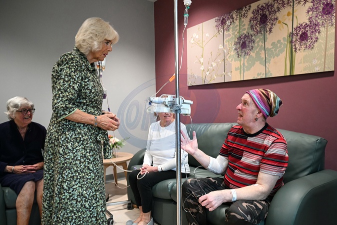 Britain's Queen Camilla (L) speaks and meets with cancer patients as she visits the Dyson Cancer Centre, at the Royal United Hospitals Bath NHS Foundation Trust, in Bath, western England, on September 3, 2024. The new Dyson Cancer Centre brings together the majority of the Royal United Hospital's cancer services, including a research hub, chemotherapy and radiotherapy services, a 22-bed in-patient ward, a dedicated pharmacy and nuclear medicine and physics teams., Credit:JUSTIN TALLIS / Avalon