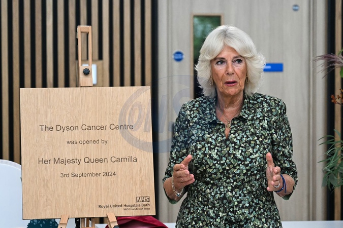 Britain's Queen Camilla (R) delivers a speech after unveiling a plaque for the official opening of the Dyson Cancer Centre part of the Royal United Hospitals Bath NHS Foundation Trust, in Bath, western England, on September 3, 2024. The new Dyson Cancer Centre brings together the majority of the Royal United Hospital's cancer services, including a research hub, chemotherapy and radiotherapy services, a 22-bed in-patient ward, a dedicated pharmacy and nuclear medicine and physics teams., Credit:JUSTIN TALLIS / Avalon